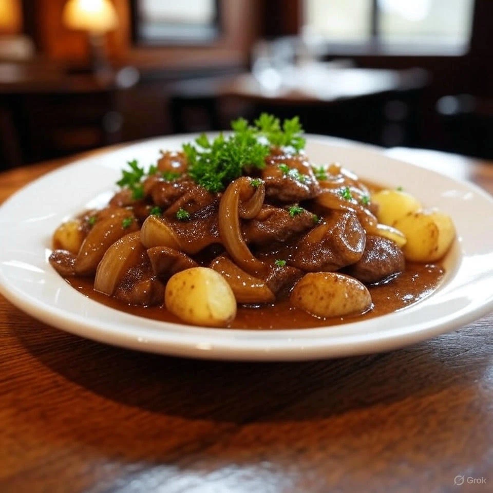 Der findes næppe en mere elsket og traditionsrig hverdagsret i Danmark end engelsk bøf med bløde løg, brun sovs og kartofler. Denne robuste og velsmagende ret har i generationer været et fast indslag på middagsbordet – både i hjemmet og på de klassiske kroer. Kombinationen af saftig oksebøf, karamelliserede løg, fløjsblød brun sovs og kogte kartofler er enkel, men uovertruffen i smag og mæthed.
